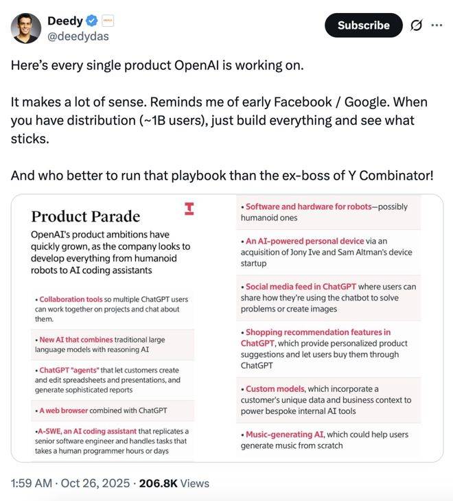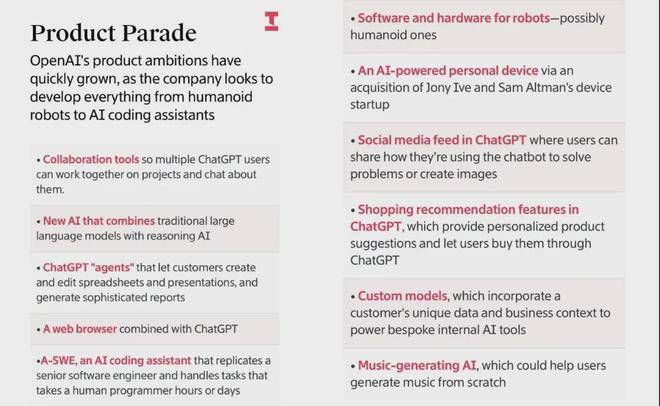 顶级分发渠道(ChatGPT)+ 铺开多条产物线——人形机械人、Agent、小我AI设备、社交、浏览器、购物、音乐、定制化模子……啥都有?