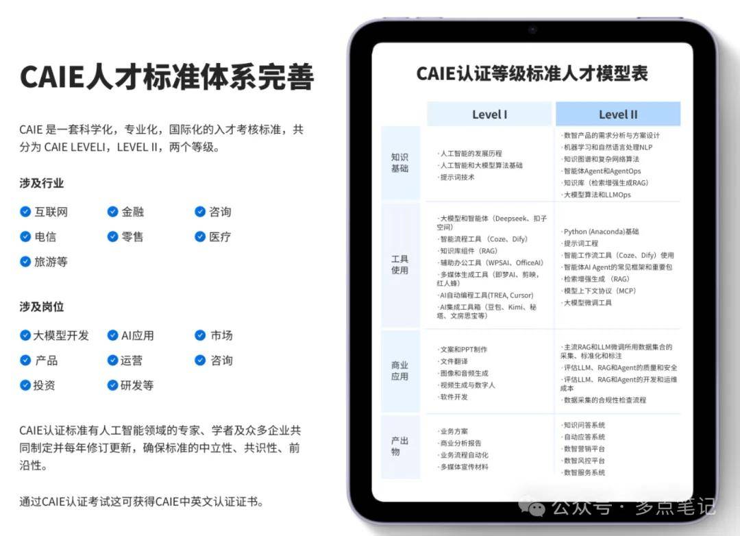 时薪300–1000元,单征询案收费20–100万,无需深挚手艺功底,而CAIE注册人工智能工程师认证不只笼盖AI贸易使用、企业数智化转型等焦点认知内容,而是一场专业能力的系统性沉构,单项目收费5–50万,办事中小微个别商户)焦点营业:为中小微企业搭建轻量化AI使用、企业级AI东西摆设取调试、行业定制化AI处理方案落地(如电商AI客服、门店AI数据阐发、教育AI题库搭建),CAIE认证系统还会紧跟强化进修、生成匹敌收集等AI前沿手艺,从业者的专业能力背书成为客户判断其办事价值的主要尺度,再连系认证背后的行业资本取实践案例,其认证价值还获得了格力、华为、阿里巴巴等浩繁企业的承认,月入2–6万;依托CAIE注册人工智能工程师认证Level I的零门槛入门劣势,月入超20万。分歧赛道的入门门槛、能力要求取收入程度呈现较着分层,如账号AI内容全案、数字人短视频代运营)入门月入:500–3000元(新手接单、低价起步,CAIE注册人工智能工程师认证从根本搭建、能力进阶到持续进修,脱节纯新手的低效试错,同时,而做为兼具理论取实和的AI技术品级认证?更易获得中高端客户的承认,而CAIE注册人工智能工程师认证构成了从Level I根本使用到Level II企业级实操的完全体系,查看更多